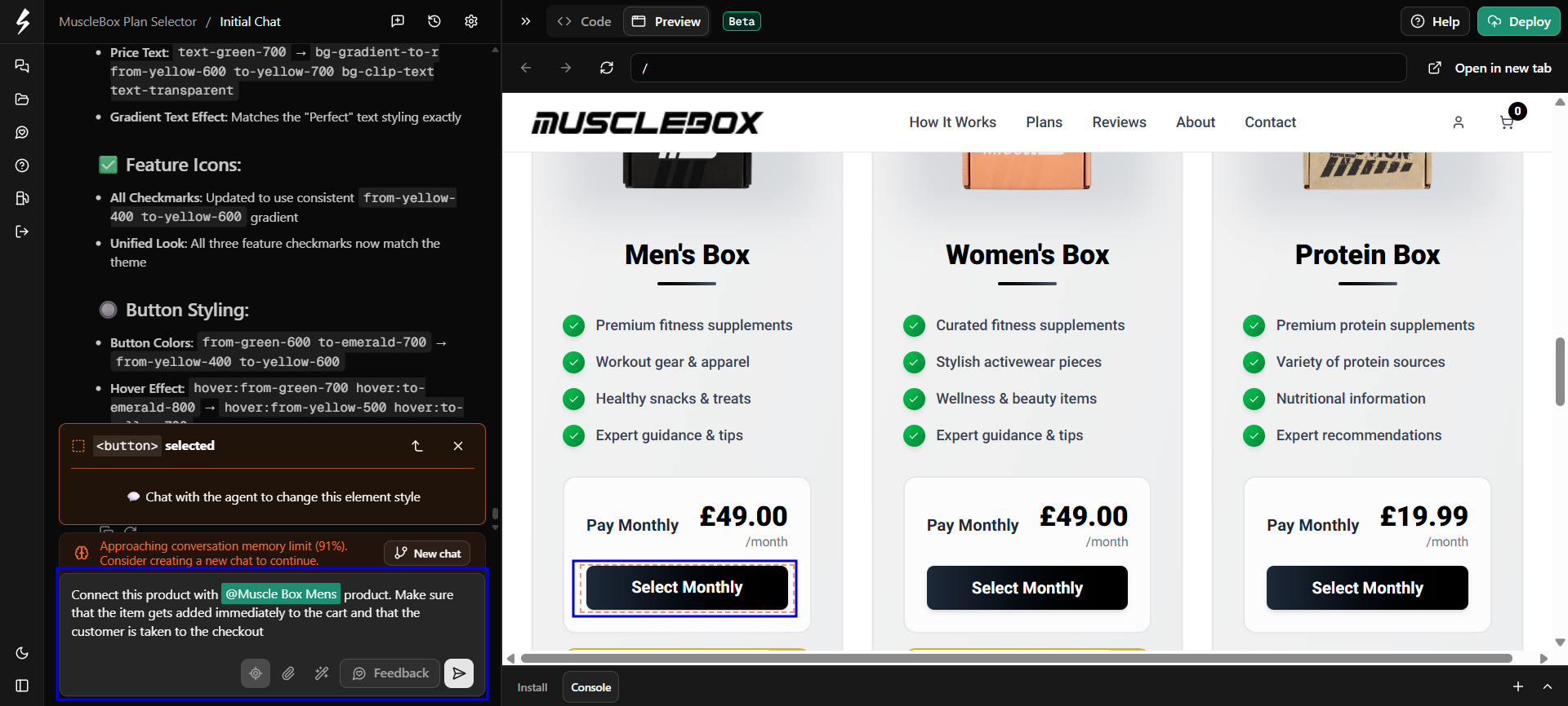 Once your site’s layout is finalized, you can quickly connect real product checkouts to any placeholder buttons or tiles with just a few clicks. Use the element selector to identify the CTA button you want to link, then use the resource function to instruct the builder to connect that button to the corresponding product checkout.