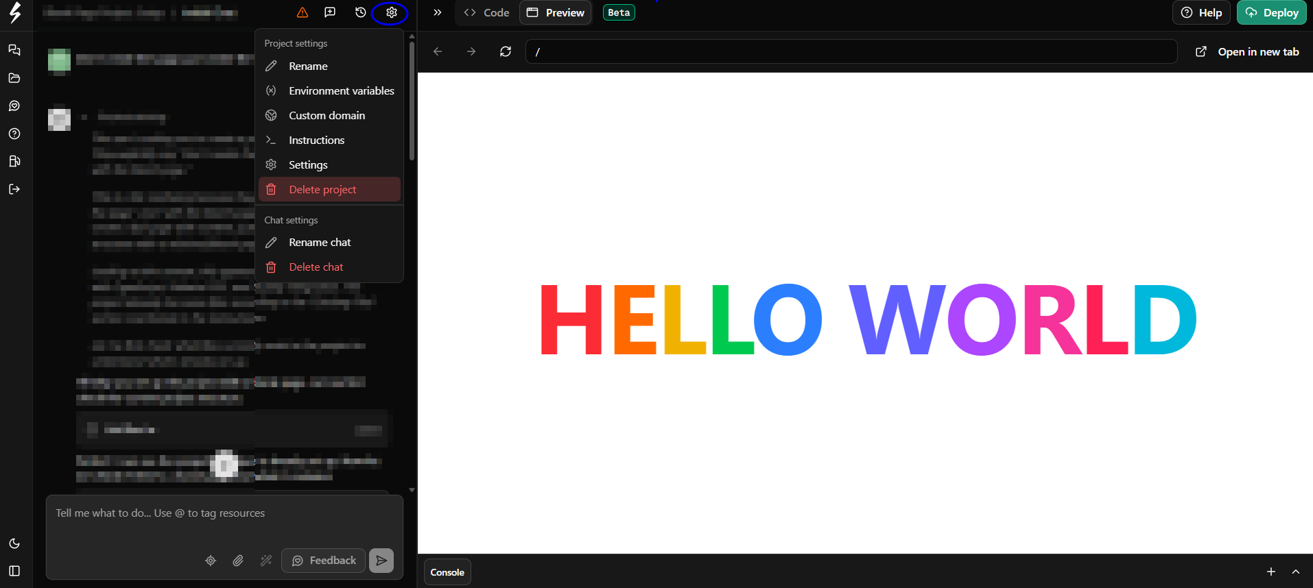 You can find Project Settings in the chat column of your builder's Dashboard. Under Project settings panel you are able to manipulate the name of both the chat you're currently working on and the project. You are also able to delete either of them.