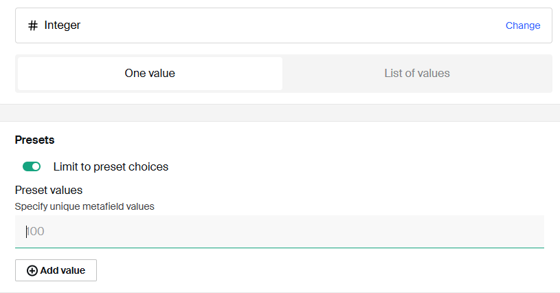 When choosing specific types for metafields, you are able to preset values customers will be able to choose from. Similar to this, you are able to choose whether the metafield will have only single value or multiple values to choose from.