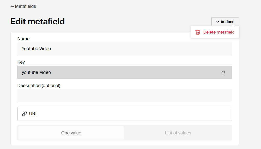To delete metafields, go to a specific metafield, click on the Actions drop down and select to delete.