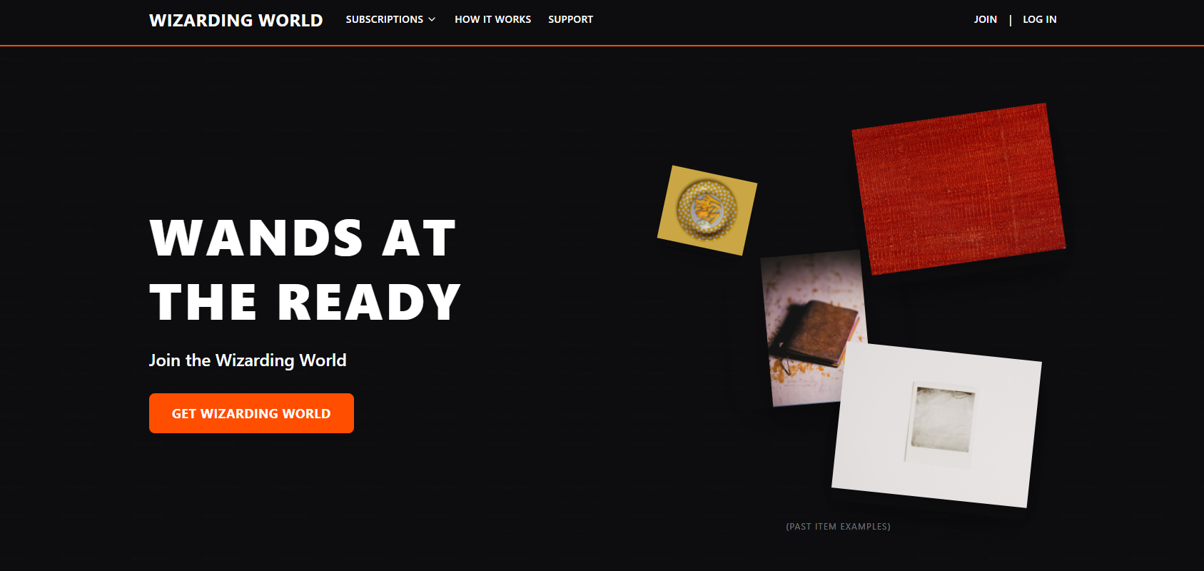 Recreate a hero section inspired by the attached example. Use a full-width layout with a dark navigation bar at the top containing the logo on the left, a “Subscriptions” dropdown, and “How It Works,” “Support,” and “Join | Log In” links on the right. Below the header, include a large hero banner with a split composition. The left side should have bold uppercase headline text “WANDS AT THE READY” and a subheadline “Join the Wizarding World” with an orange CTA button labeled “Get Wizarding World.” Use black text (#000000) for headings and orange (#FF4E00) for the button, with white text inside the button.