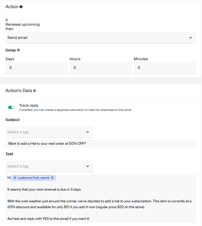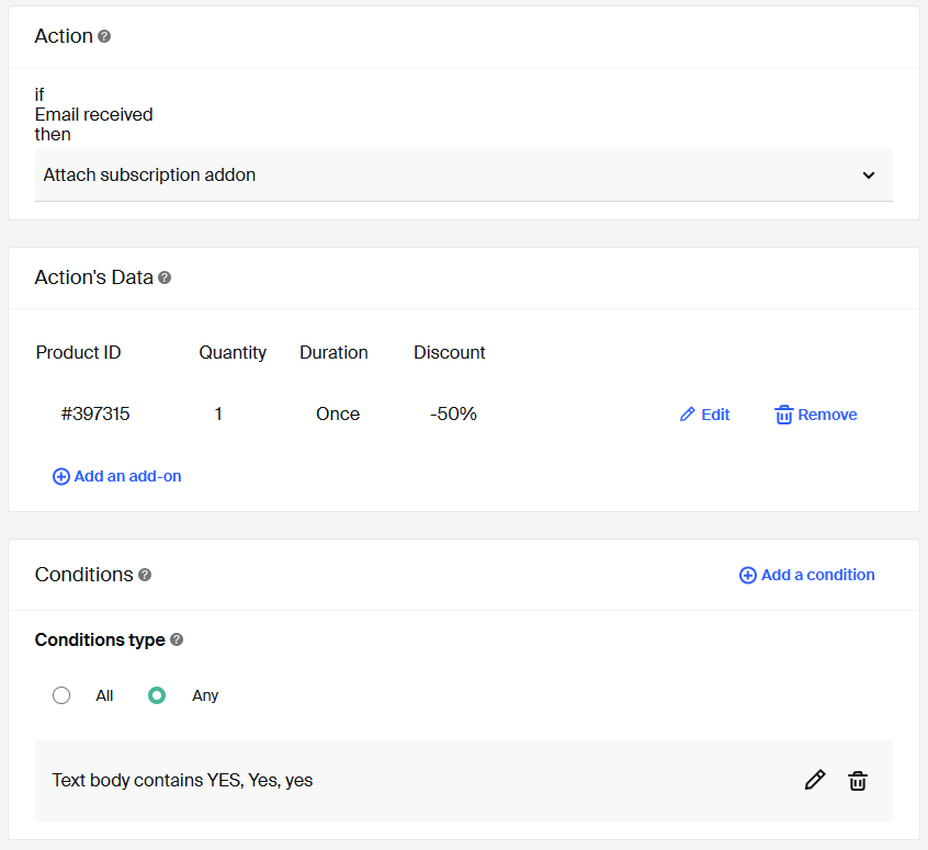 Now you'll need to create the automation that will catch those customer's replies from customers that replied with YES to the previous email and that will automatically add the item (at a 50% discount) to their next order. Here's how you do it: