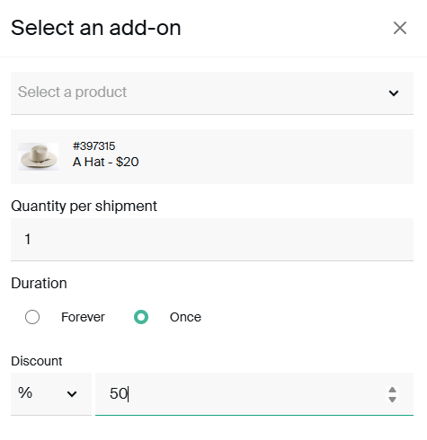 In an example above, I'm adding the offered item (a hat) as a one time offer (will be attached to their next box) and at a 50% discount (customer will be charged $10 which is 50% of the product's original price).