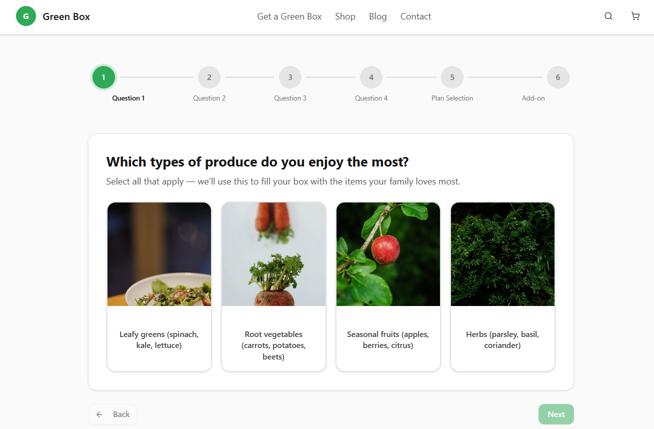 Create a product page with the following URL: /green-box-standard-survey for the product @Green Box Standard. The page should include a breadcrumb-style menu for the survey/quiz attached to this product (Survey ID: 17403). The flow should include the following steps: Survey Steps: Display all steps from the attached survey. Plan Selection: After completing the survey, prompt the customer to select one of the plans available for the @Green Box Standard product. Optional Add-On: The final step should present the optional add-on product @Fresh Boost Pack. For this step, display two buttons: Add to my box – if the customer clicks this, add the optional add-on product to the cart. No, thanks – if the customer clicks this, skip the add-on and lead the customer directly to the cart. This step is optional. Ensure that all previously selected preferences from earlier steps are collected and passed to the cart/checkout, so that the cart reflects all customer choices correctly. Checkout: Once all steps are completed, redirect the customer directly to the cart/checkout page with all selected options and preferences saved and passed to checkout.