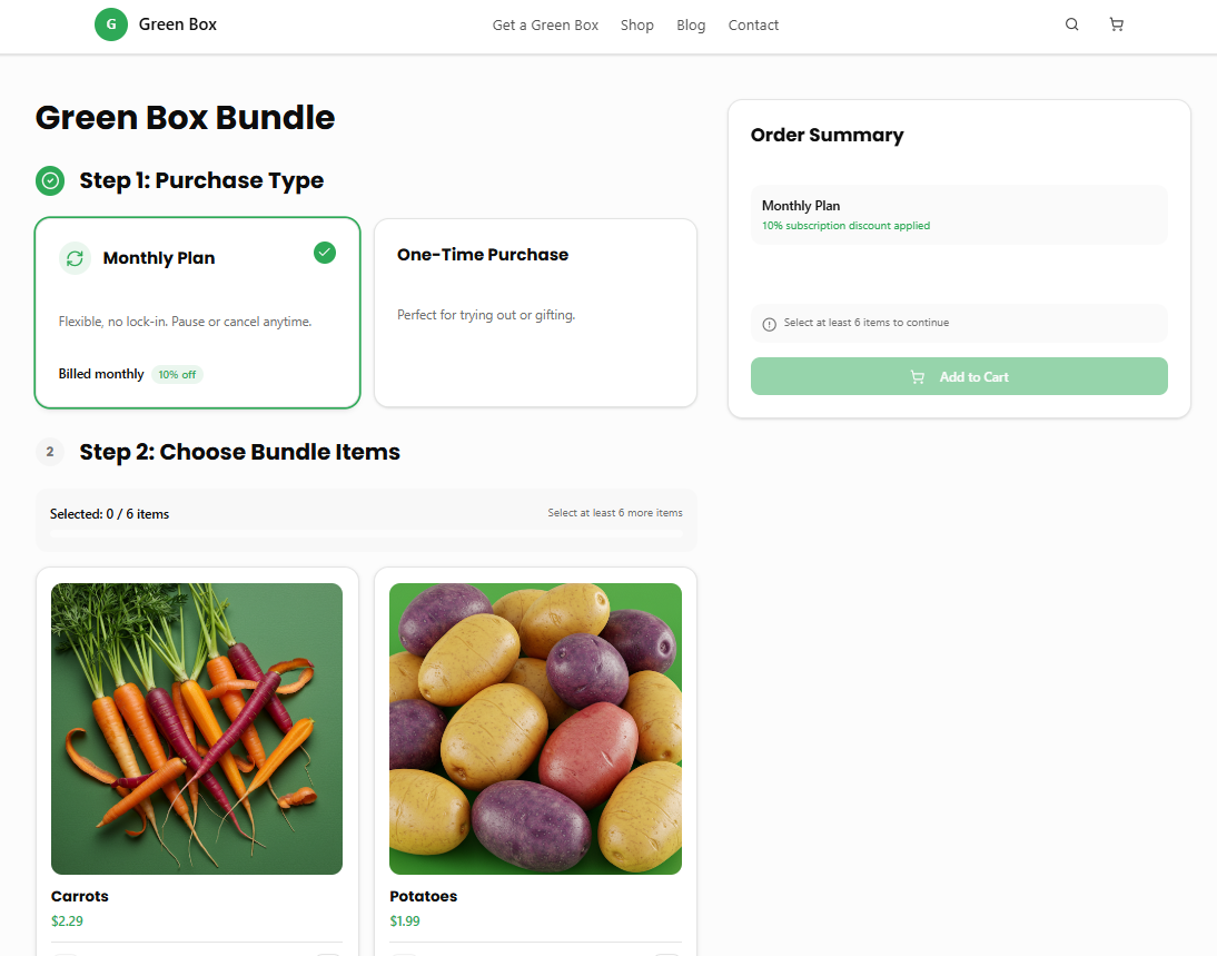 Create a Bundle View Page for @Green Box Bundle similar to a standard eCommerce product detail page, following modern UI/UX best practices.Display a vertical step-by-step layout under the main heading:Step 1: Purchase Type • Monthly Plan — Flexible, no lock-in. Pause or cancel anytime. • One-Time PurchaseStep 2: Choose Bundle Items • Show all one-time products with images included in the bundle with quantity logic and limits applied.Once all logic and validation work correctly, allow users to Add to Cart.Use a polished, modern design aligned with the current website theme — no extra content, just a clean, conversion-focused layout.