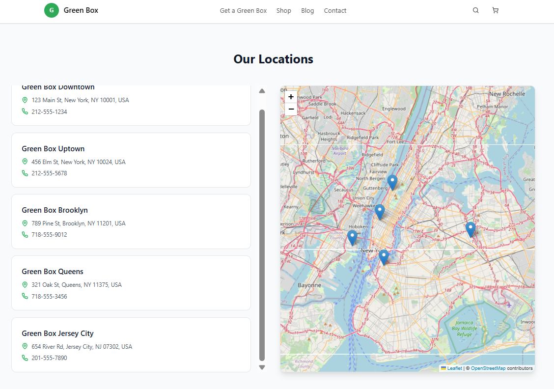 We need to create a map locator on the /store-locator page. - On the left side, show a list of clickable store locations with their name, address, and phone number. - On the right side, show a map with pins for each location. - Make sure the pins are displayed correctly and are clickable, showing the store info. Use the following store locations: - Green Box Downtown 📍 123 Main St, New York, NY 10001, USA 📞 212-555-1234 - Green Box Uptown 📍 456 Elm St, New York, NY 10024, USA 📞 212-555-5678 - Green Box Brooklyn 📍 789 Pine St, Brooklyn, NY 11201, USA 📞 718-555-9012 - Green Box Queens 📍 321 Oak St, Queens, NY 11375, USA 📞 718-555-3456 - Green Box Jersey City 📍 654 River Rd, Jersey City, NJ 07302, USA 📞 201-555-7890 Use the Leaflet library (https://leafletjs.com/ ) for the map and ensure it works properly with all pins.